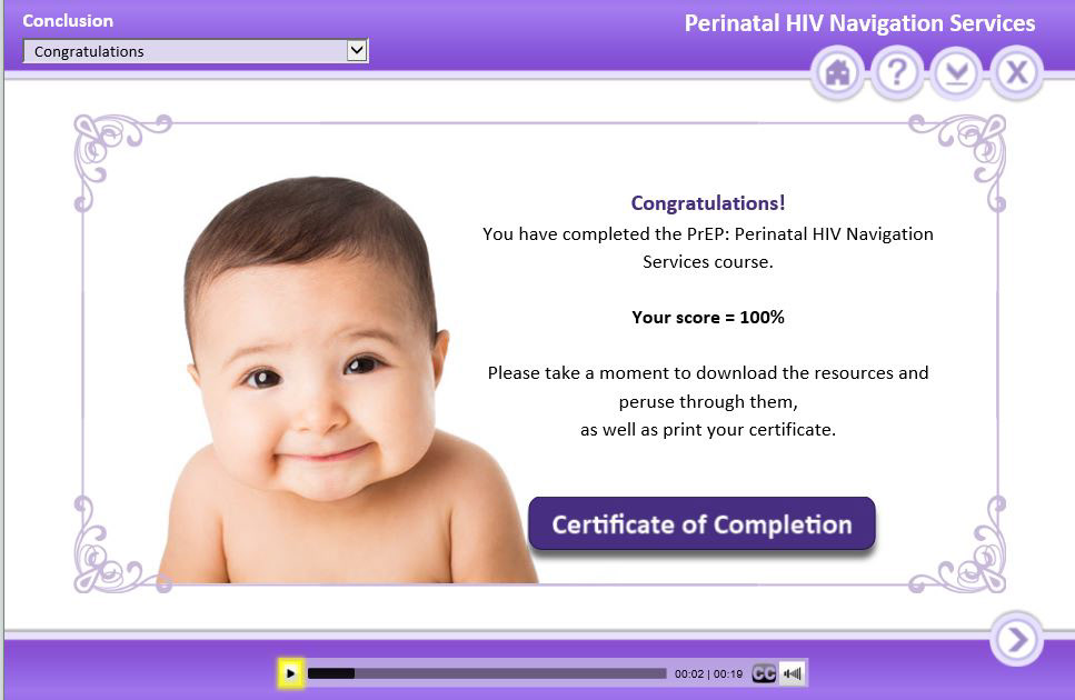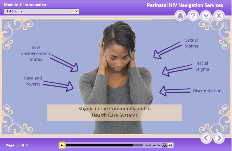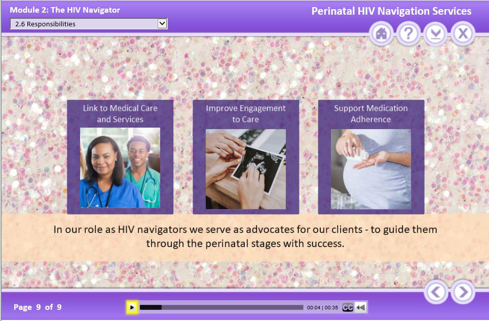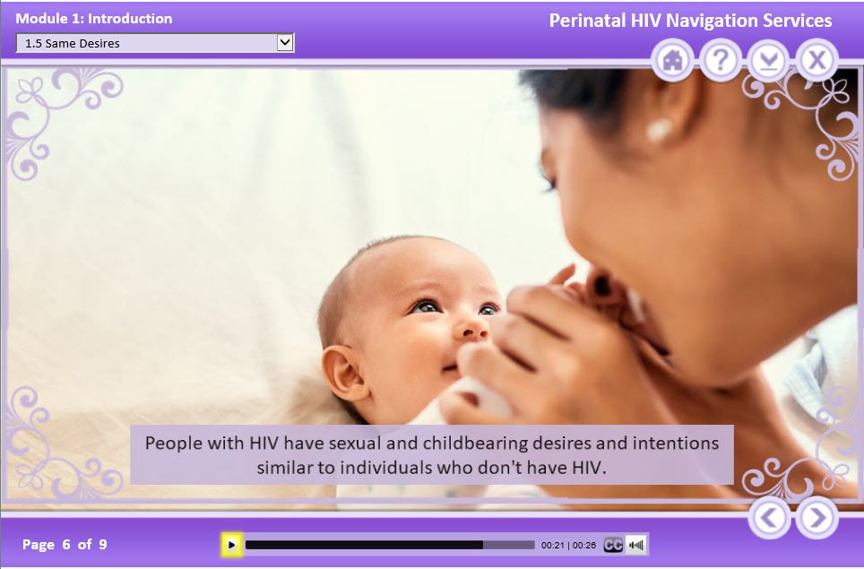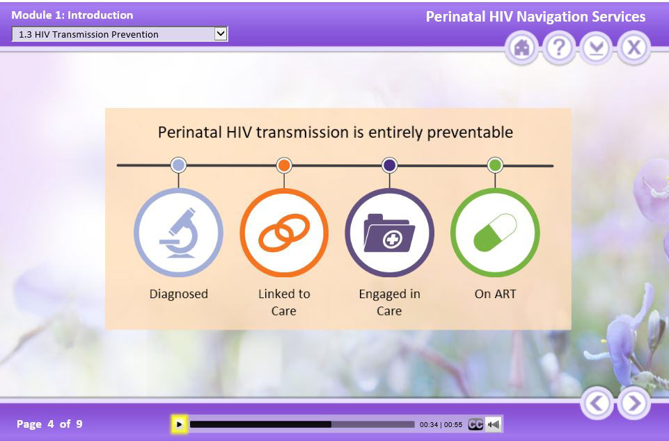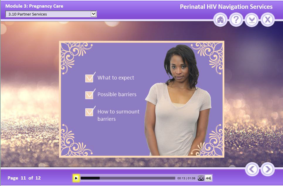This course follows the story of Beatrice, a woman who finds out she has HIV when she is 8 weeks pregnant, and her HIV navigator, Claire. The course features 6 short video interactions between Beatrice and Claire.