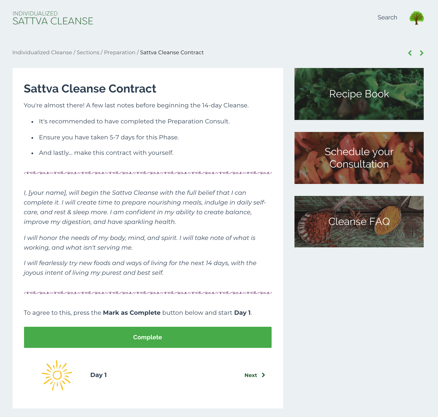 The Sattva Cleanse, a 14-day Ayurvedic-Inspired Online Food & Wellness Program, is my first personal course. I have long yearned to write, design, and construct an online course of my own, to give voice to years of experience with Ayurvedic, Yogic, Shamanic, and Ancestral healing modalities. This course was created on the Kajabi platform.