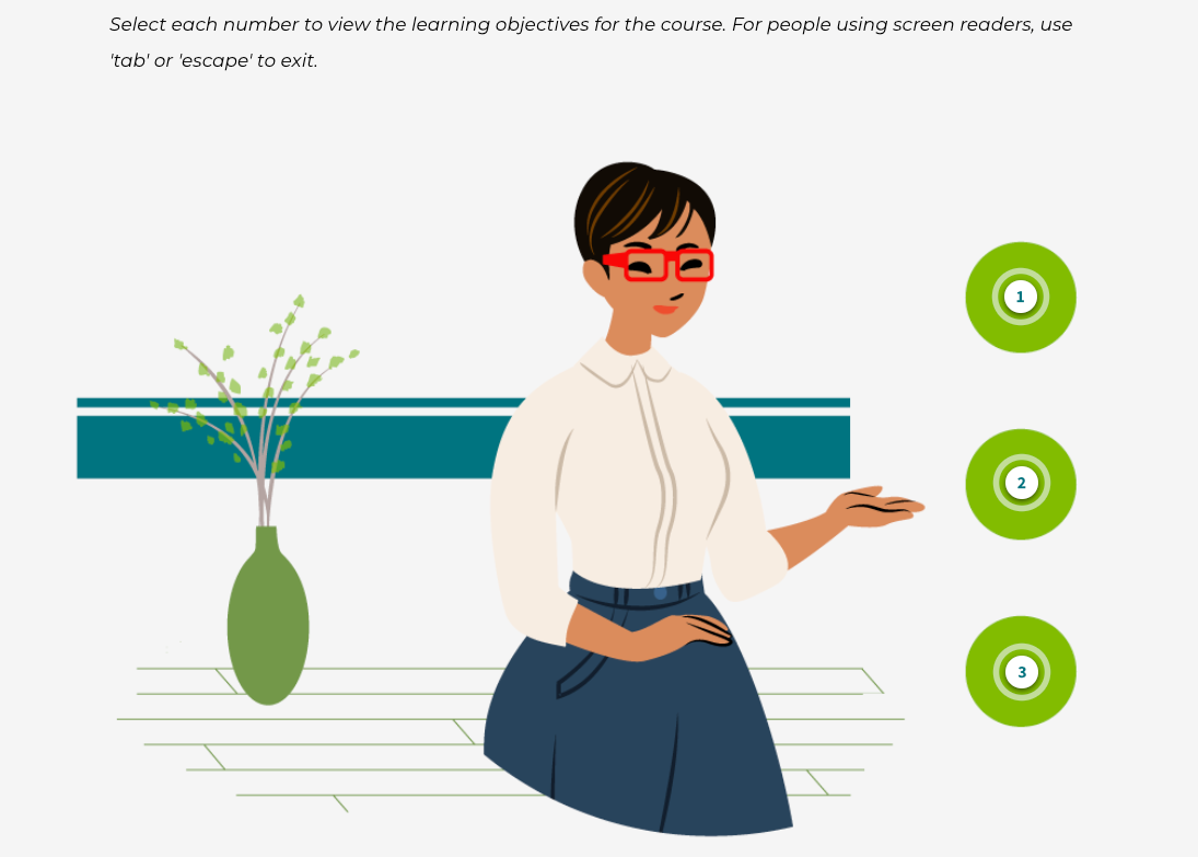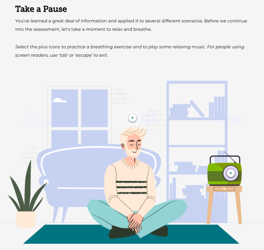 Some of the favorite parts of the courses, as identified during pilot studies, were the relatable characters and emphasis on scenario-based learning, as learners were taken through the complex content via case studies. We also included an accessibility consultant, who provided immeasurable feedback on viewing the course through screen reader technology.