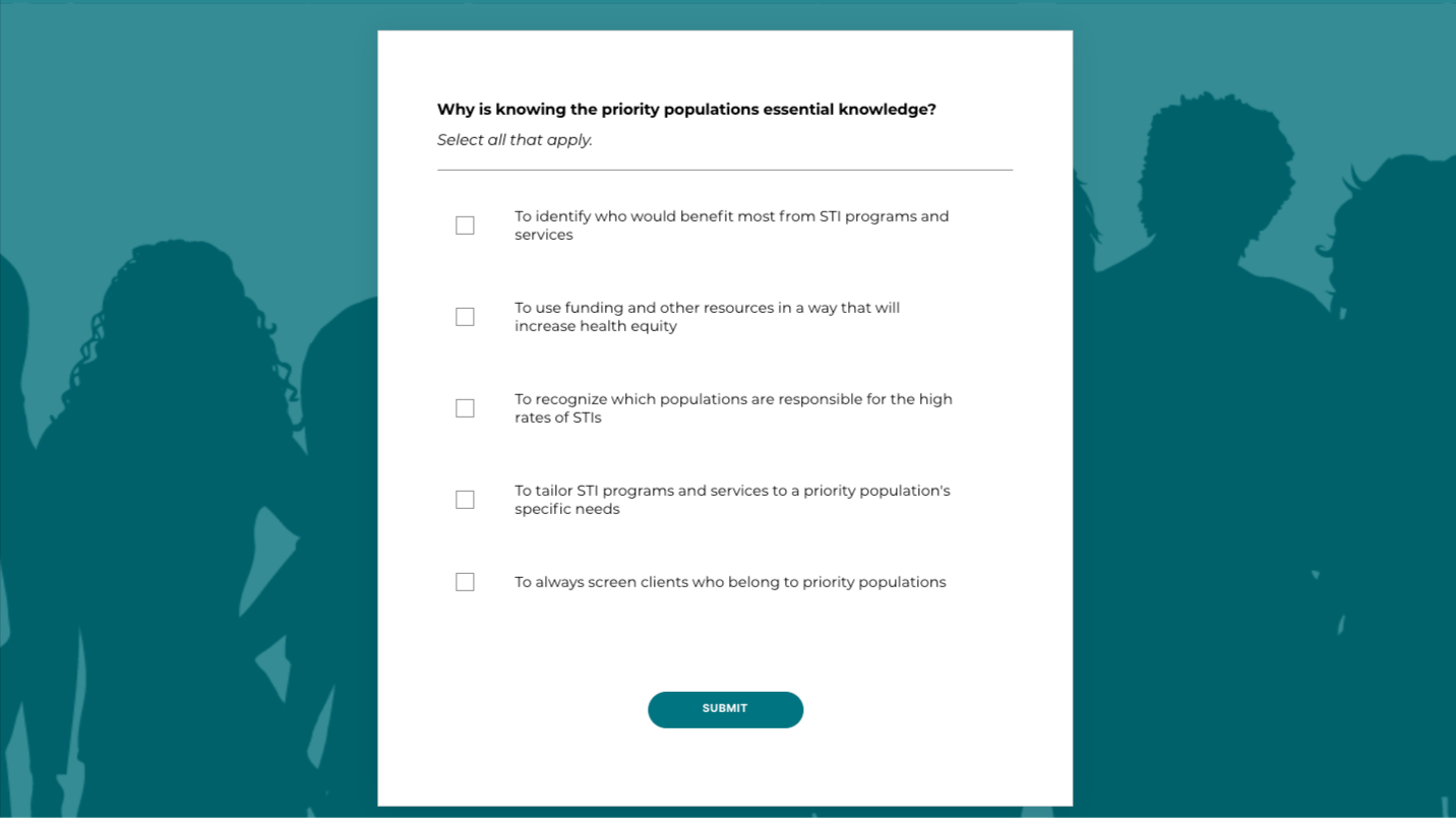 This project included two courses, created in collaboration with the Office of STI/HIV/Viral Hepatitis at Colorado Department of Public Health (CDPHE). The client felt that existing courses in Rise 360 lacked visual diversity and engaging content. Hence, a vital part of the design were custom imagery and Storyline 360 blocks.